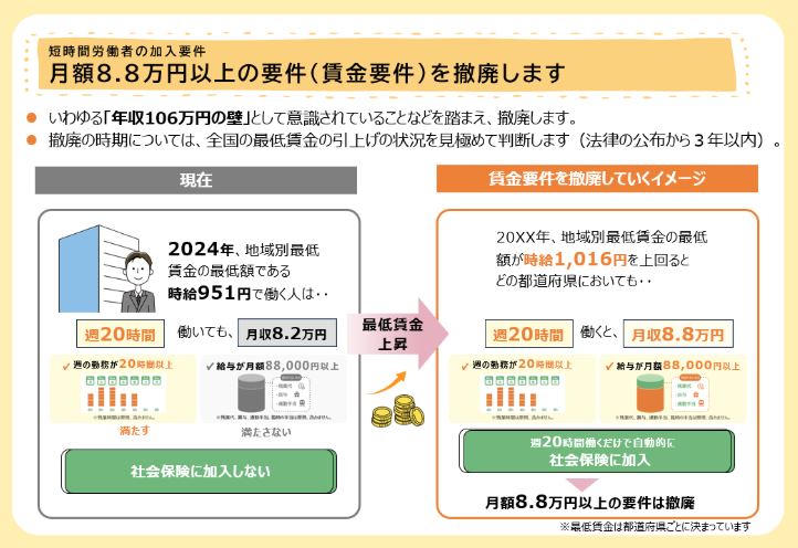 「年収106万円の壁」として意識されていた、月額8.8万円(年収106万円)の要件も撤廃となります。撤廃の時期は、改正法の公布から3年以内の政令で定める日とされていますが、全国の最低賃金が1,016円以上となることを見極めて判断されます。
