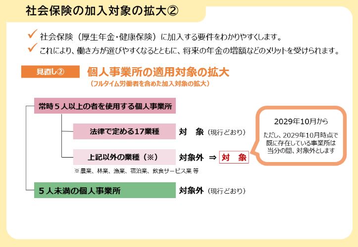 現在、常時5人以上の従業員を使用している法定17業種(弁護士・税理士・社会保険労務士等の法律・会計事務を取り扱う士業など)の個人事業所が社会保険加入対象となっていますが、今回の改正では、法定17業種に限らず常時5人以上の従業員を使用する全業種の事業所を適用対象とするよう拡大されます。